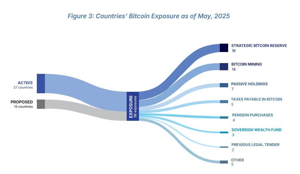 The report identified active Bitcoin exposure in 27 countries, while 13 have proposed legislation to gain such exposure.