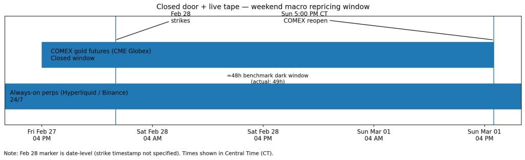 Timeline diagram shows COMEX gold futures closed from Friday afternoon through Sunday evening while always-on perpetual contracts on Hyperliquid and Binance operated continuously during the 48-hour weekend window.